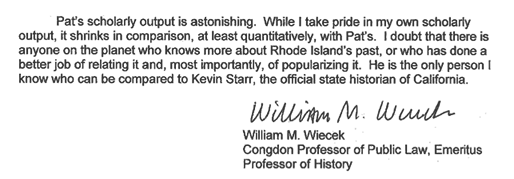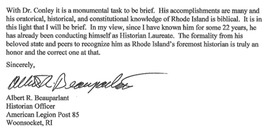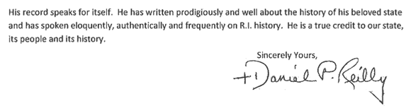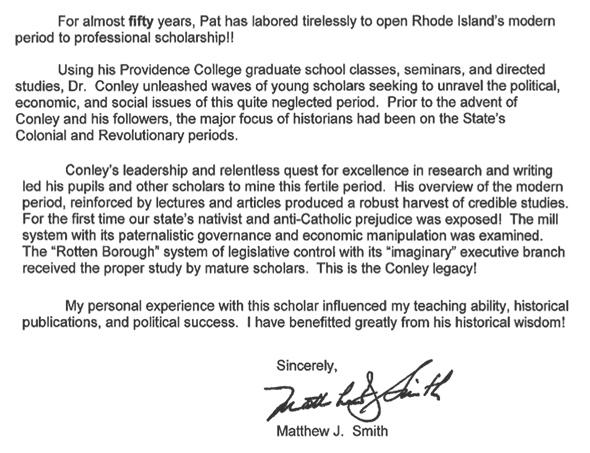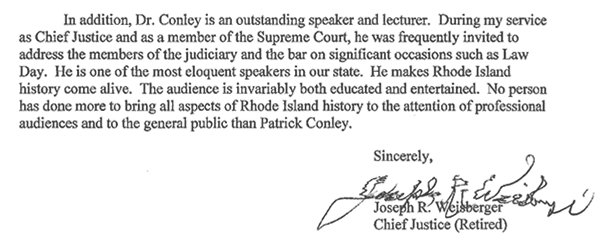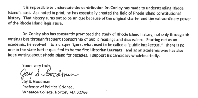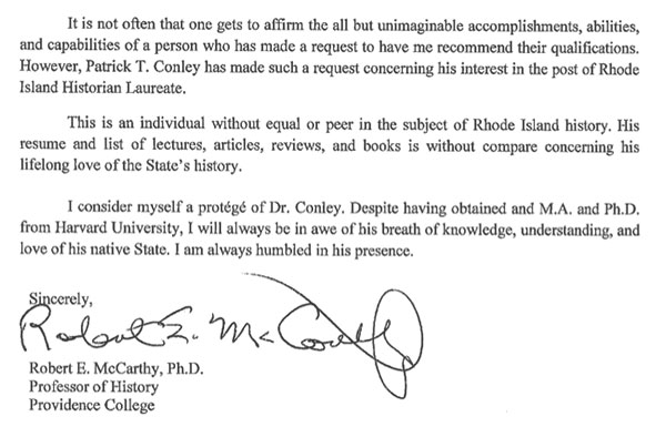 Patrick Conley’s interest in becoming the first Historian Laureate of Rhode Island prompted him to solicit letters of recommendation addressed to the Secretary of State (the appointing authority) relative to his qualifications and suitability for that newly-created post.